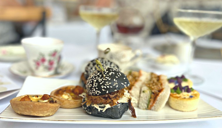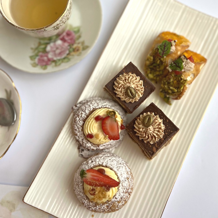 Starting with the savouries on the bottom tier, we are mesmerised by the Middle Eastern flavours in both the sweet potato quiche and Moroccan chicken sandwich, the latter of which is sprinkled with dukkah.