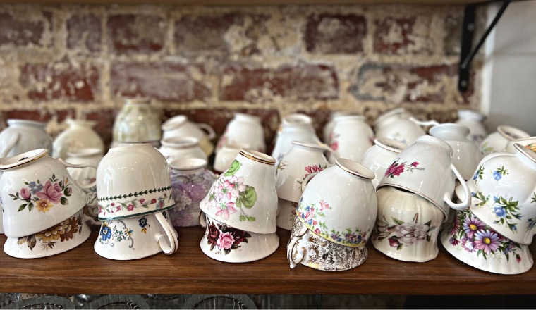 Tables are set with mismatched fine bone china, including the likes of Royal Albert and Crown Trent.