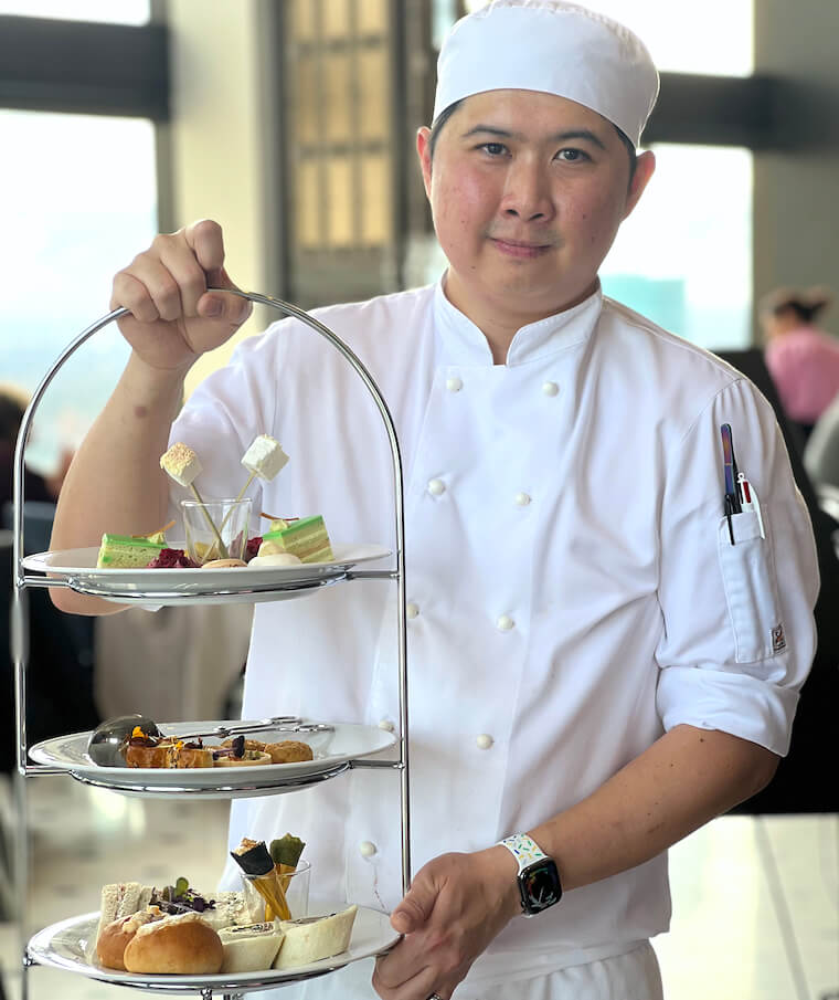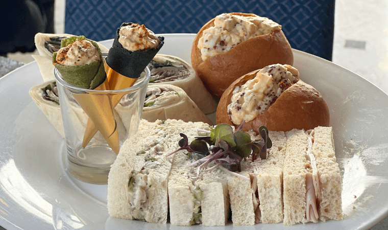 The high tea itself is served on a traditional three-tier stand, with freshly baked sultana scones served separately, accompanied by generous portions of jam, cream and lemon curd.