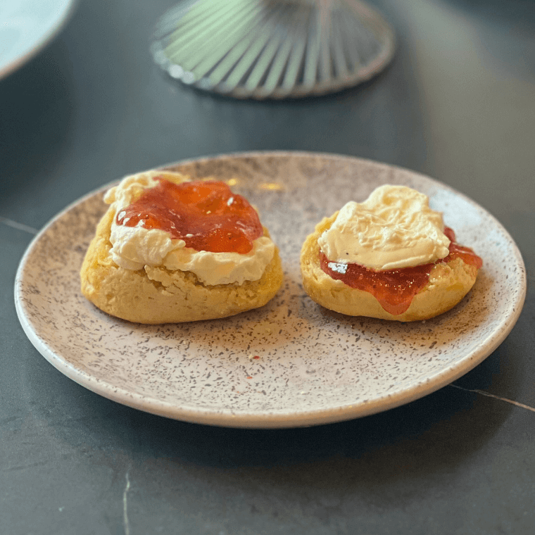 - Freshly baked sultana scones served with Tahitian Chantilly cream and homemade preserves (h)