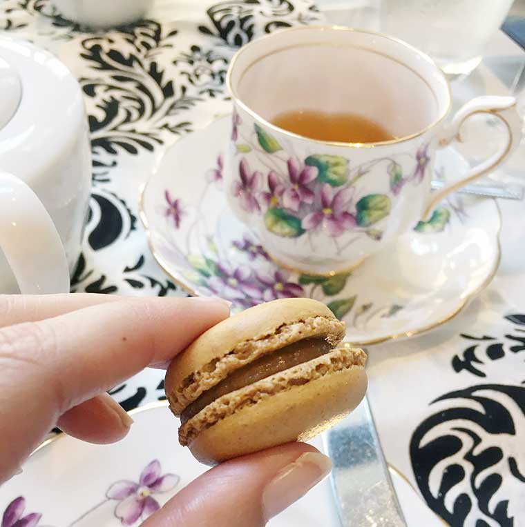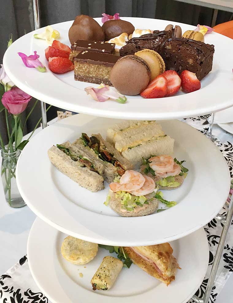 High Tea is presented on traditional three-tier high tea stand laden with goodies and decorated with fresh flowers. After our initial excitement of the special delivery, I realise something is missing…. where are the scones?!? Is this a modern version of high tea? Curious about the lack of scones, but still ravenous we set about devouring the first layer.
