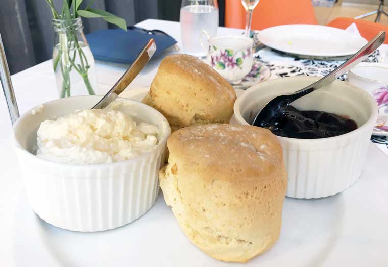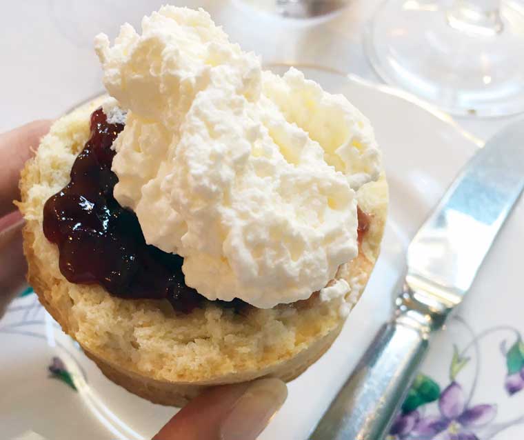 Once we’d eaten these morsels, our waiter removed the empty plate and replaced it with a plate of freshly made scones! They weren’t missing at all, just a bonus fourth tier and they were worth the wait. Warm scones with just the right amount of outer crunch and served with clotted cream and strawberry jam. Delicious!