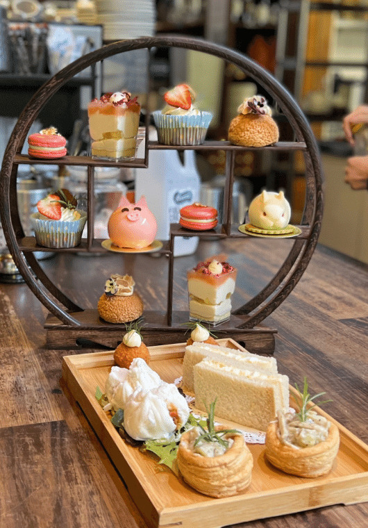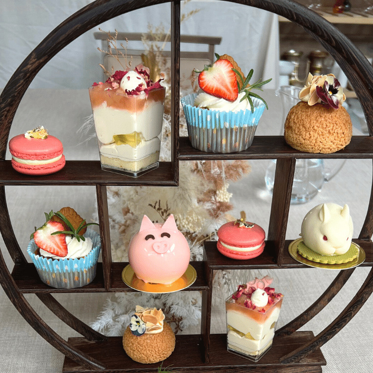 Our sweets are delivered on an Oriental styled high tea stand so that they equally standout to us. However, it’s impossible not to pay special attention to the pig and rabbit mousse moulds which look just too precious to eat! Like how I started my savouries, I begin my sweets course with the softest and lightest looking dessert which happens to be the Peach Lychee Trifle. As a child I loved trifles and the contrast of all the delicate textures. This Asian fusion take on a traditional trifle is well executed. I was thoroughly impressed and can admit shamelessly that I scooped the dessert cup clean.