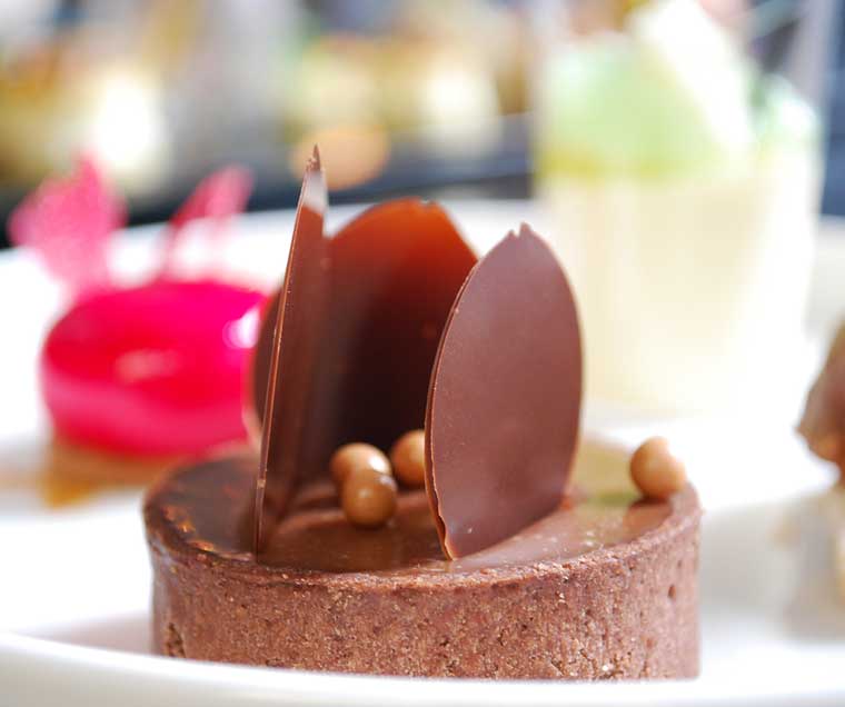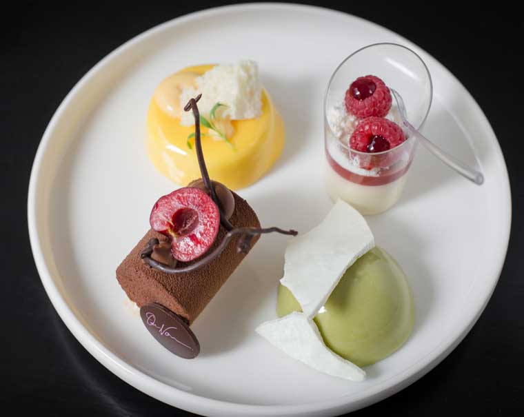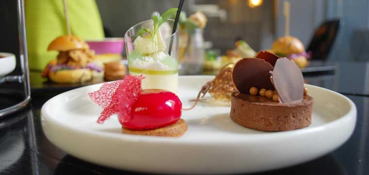 While the seating looks like giant liquorice all-sorts, and the colour scheme is inspired by chocolate and cherry, Om Nom’s high tea menu does actually include an initial savoury course. When it’s brought to the table on a long slate platter, it smells absolutely delicious. The miniature savoury cheesecake is very rich, but tastes tangy, and I have no trouble polishing it off. The crispy chicken sliders and mousse cones add some crunch and texture to the offering and the spinach and feta puffs, while certainly not ground-breaking, are pleasantly flaky and warm. Om Nom also offers a vegetarian version of the high tea, which includes a creamy avocado mousse cone.