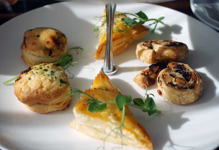 Chef Chetan explained the High Tea and left us to eat our way through the tower. We started with the delicious sandwiches which were of a size that they were served on a side plate. The fresh white bread served with the delicious Ora King Salmon and chive cream cheese was house made and the kind of bread that I could accidentally eat a whole loaf of, the crust had a perfect crunch and the bread was perfectly fluffy. The Rueben with pastrami from the local supplier Ontrays was also delicious. The sandwiches were the most I have enjoyed a sandwich at a High Tea and we both liked that they were a decent size, in fact everything was of generous portions but not too big. Other savoury delights were a perfectly balanced Pithivier and a nice and cheesy savoury scone which we both enjoyed with the whipped butter and added the side serve of beetroot chutney.