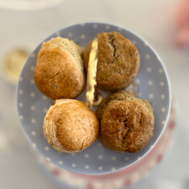 One plain and one Earl Grey Served with cream and Beerenberg Strawberry Jam