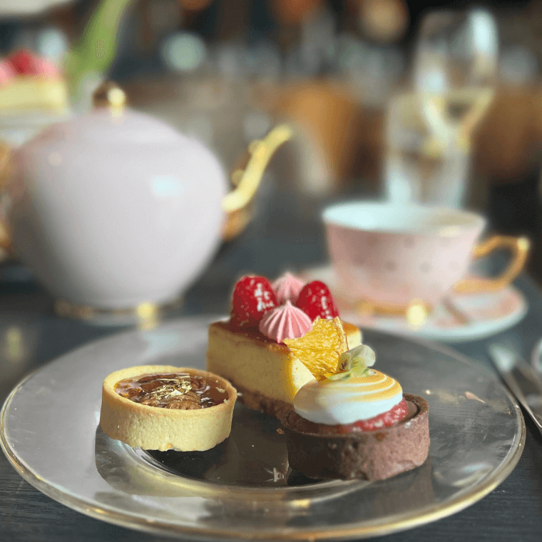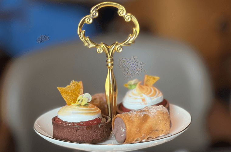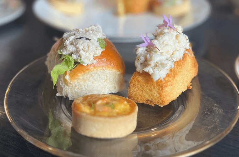 Once seated, I was treated to a glass of Perrier Jouet champagne. Adding to the glamour was the table setting, which consisted of Cristina Re plates, saucers, and then teapots filled with Seven Seas Moroccan Mint tea. It wasn’t long before the finishing touch arrived—the three-tiered tower of treats.
