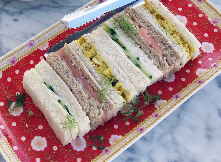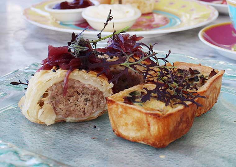 Once our glasses are full, the friendly and efficient staff delivers a traditional three-tiered stand laden with goodies, alongside a platter of freshly made sandwiches and some hot canapés. We start with the hot selection of homemade lamb sausage rolls and mushroom and zucchini quiche which were flavoursome and filling. The trio of sandwiches to follow included cucumber, smoked salmon and coronation chicken.