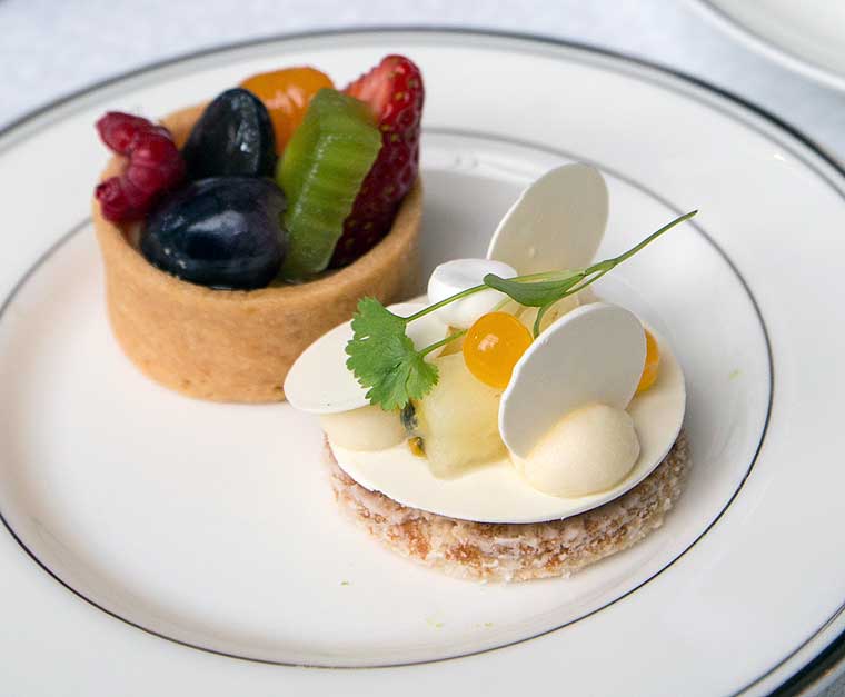The tiny fruit tart is a selection of the season’s best fruit nestled on a bed of a vanilla custard. Rich and creamy it needs the fruit to cut through, which it does perfectly.