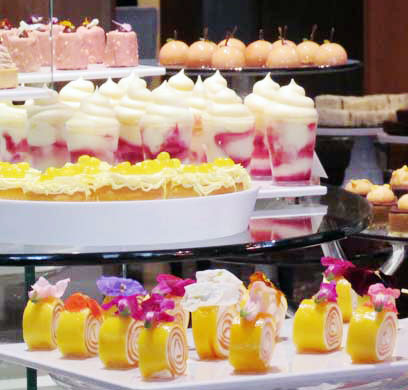 But the star of the buffet worthy of a drum roll are the sweets, with an amazing selection to choose from, arranged on stands, that were edible works of art, with ribbons, swirls and splashes of vibrant greens, pinks, yellows, a multi-coloured display decorated with delicate flower petals and decorative icing, all used to visually stunning effect.