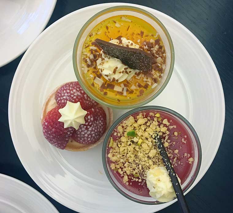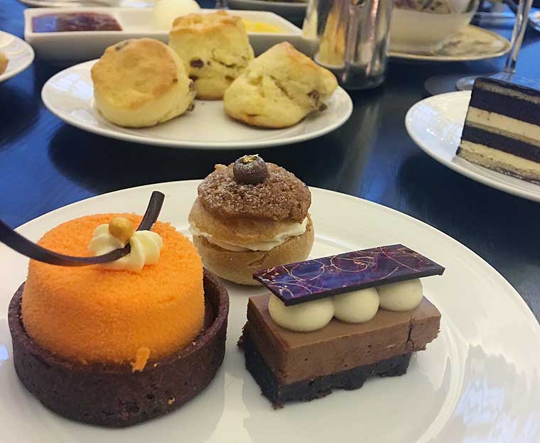 Served in the luxurious Sofi’s Lounge, with its high-vaulted ceilings, a mixture of plush sofas and felt and leather-backed seats, there’s a long table set with sandwiches and other savouries to the left, and an extensive dessert buffet in the centre of the room.