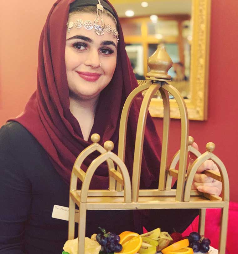 The blend of traditional English and Middle Eastern culture was highlighted through the ornate and geometric glassware; we poured tea from chrome teapots and sipped from teacups decorated in detailed Islamic geometry. The food was displayed on an ornate gold cake stand, shaped to reflect traditional Middle Eastern archways.