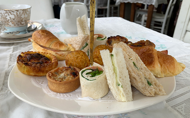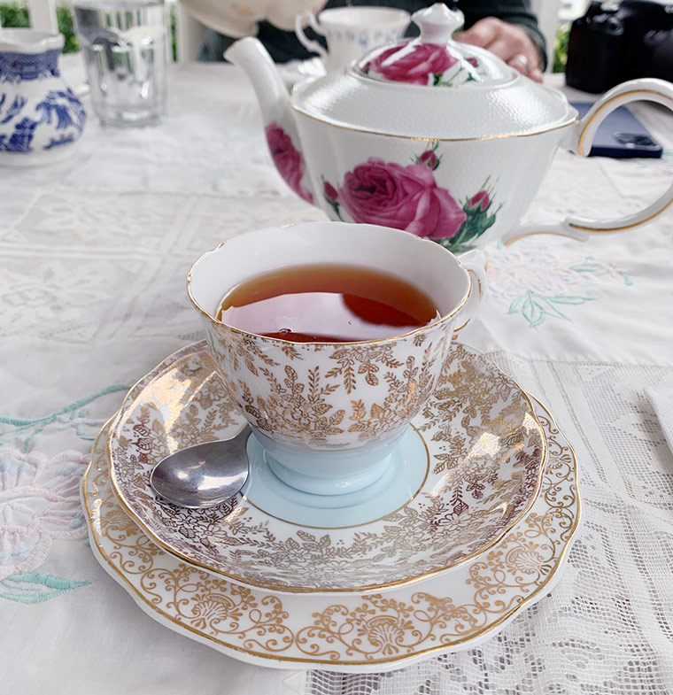 Tea is served in an eclectic collection of vintage teaware, collected over the years by the owner Sonia including her large collection of Royal Doulton Old Country Roses.