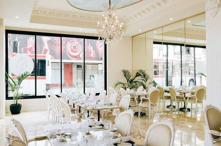 On entry, a trio of beautiful arch-shaped mirrors, lining the walkway towards the open and light-filled tearoom itself. The most striking feature of the premises is the beautiful wall of windows along the North and West sides of the building. These allow an abundance of light into the building, bouncing off the silver teaware and the white floors and walls, creating a bright and ethereal atmosphere. Opposite the western-facing window is a feature wall of floor-to-ceiling mirrored panels, framed with gold, helping again, to open and brighten up the space.