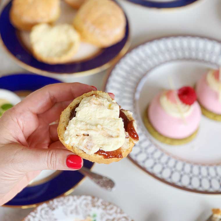 - Served with strawberry jam, lemon curd and clotted cream