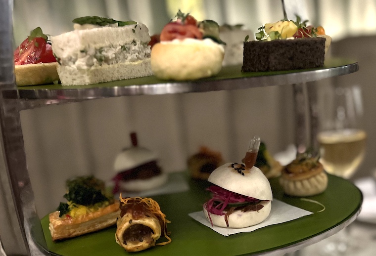 It’s a very generous spread, with four tiers to the stand! And if you are a savoury fan, this spread will not leave you wanting – there are four hot items and four cold items on the two savoury layers.