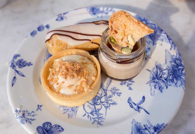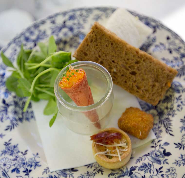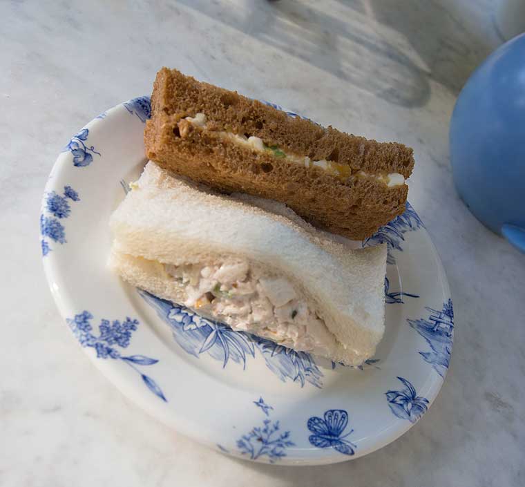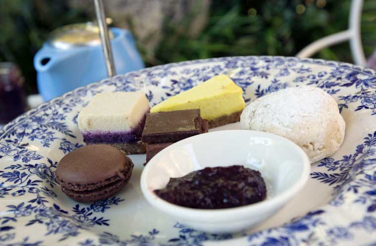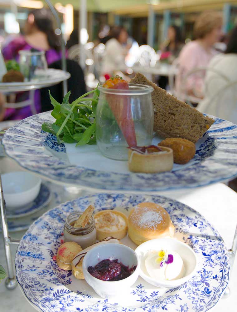 On the beautiful blue willow patterned stand of our omnivore’s plate, also lay a scone, which unfortunately, although a lot fluffier in texture, was quite stale, as were the curling sides of the poached chicken sandwiches that comprised the savoury layer of the high tea tiers. A salmon & cream cheese cornet with caviar was an unusual menu item, though, the only that really stood out taste-wise.