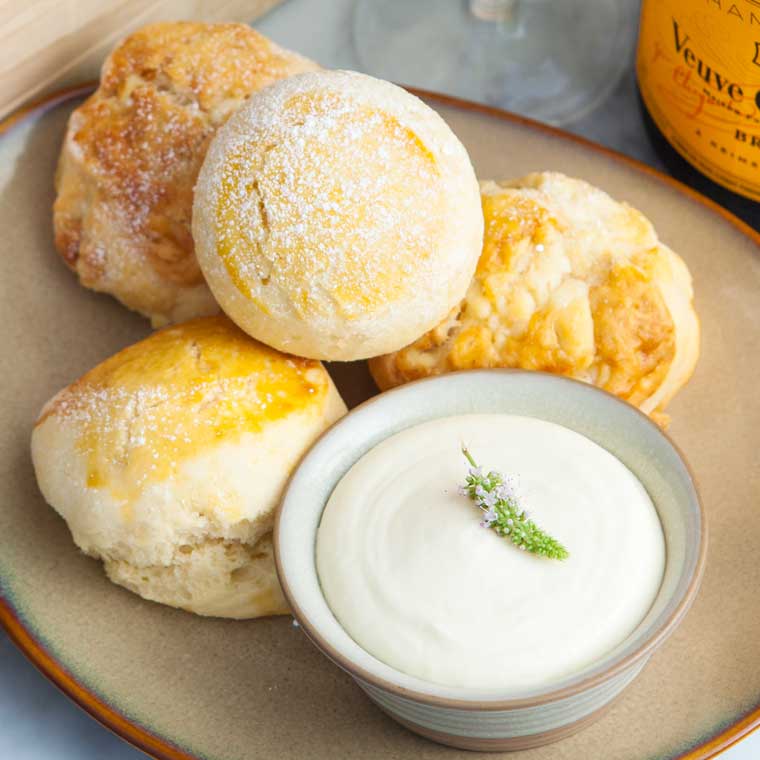 - Buttermilk scones & treacle white chocolate scones with double cream & house-made raspberry jam