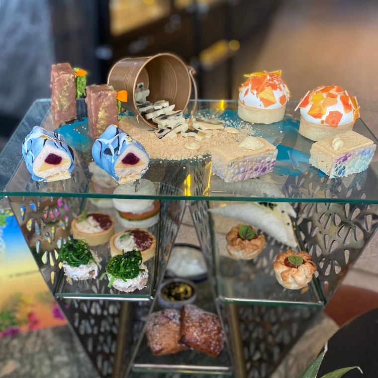 The sweet selection on the top tier is where the story is really told, kicking off an adventure for your tastebuds and imagination. The salted caramel mousse takes inspiration from endless days spent by the beach, fine golden sand, colourful coral and vibrant aquatic, the chocolate base is filled with macadamia and salted caramel mousse, topped with sand chocolate velvet spray, marzipan pearls and a chocolate seashell.