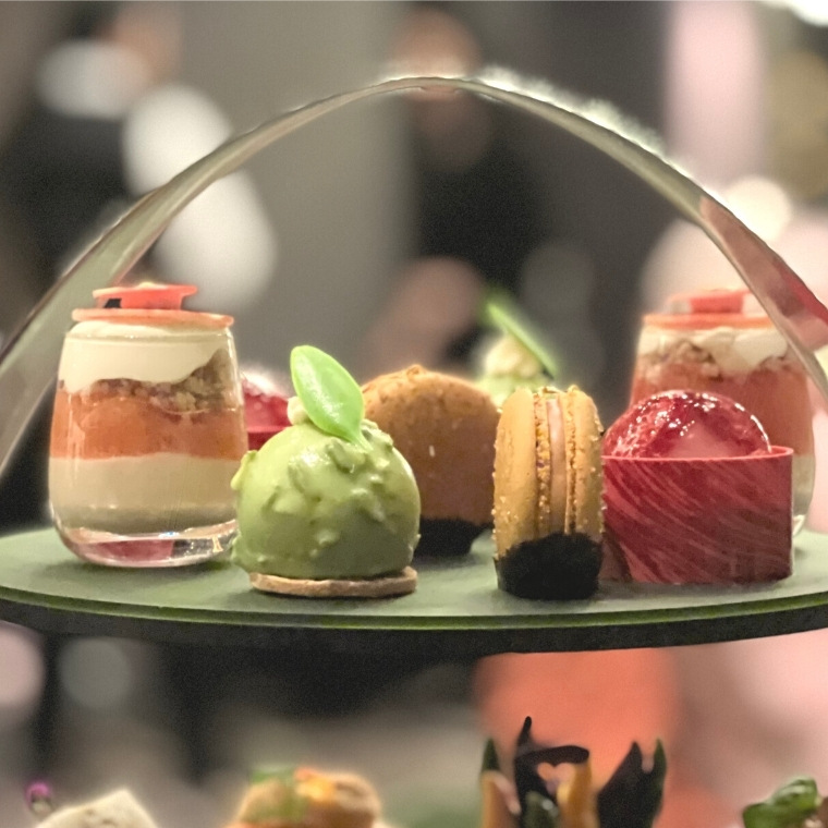Glass display cabinets with delicious desserts flank the entrance, and high tea goers have the option of being seated at the front, where you’ll enjoy a front-row seat to the hustle and bustle of the hotel foyer and are similarly sitting to be seen.