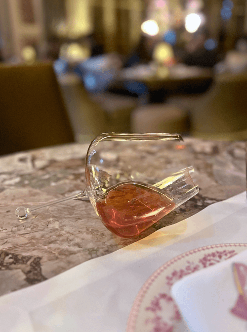 The experience begins with a glass of Maison Rare Champagne, poured into a stemless glass created for Marie Antoinette and used at her parties. The design is intentional, without a base, the glass cannot be set down, encouraging continuous sipping and merriment.
