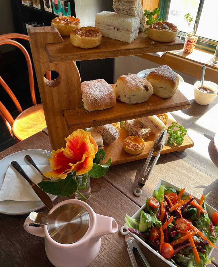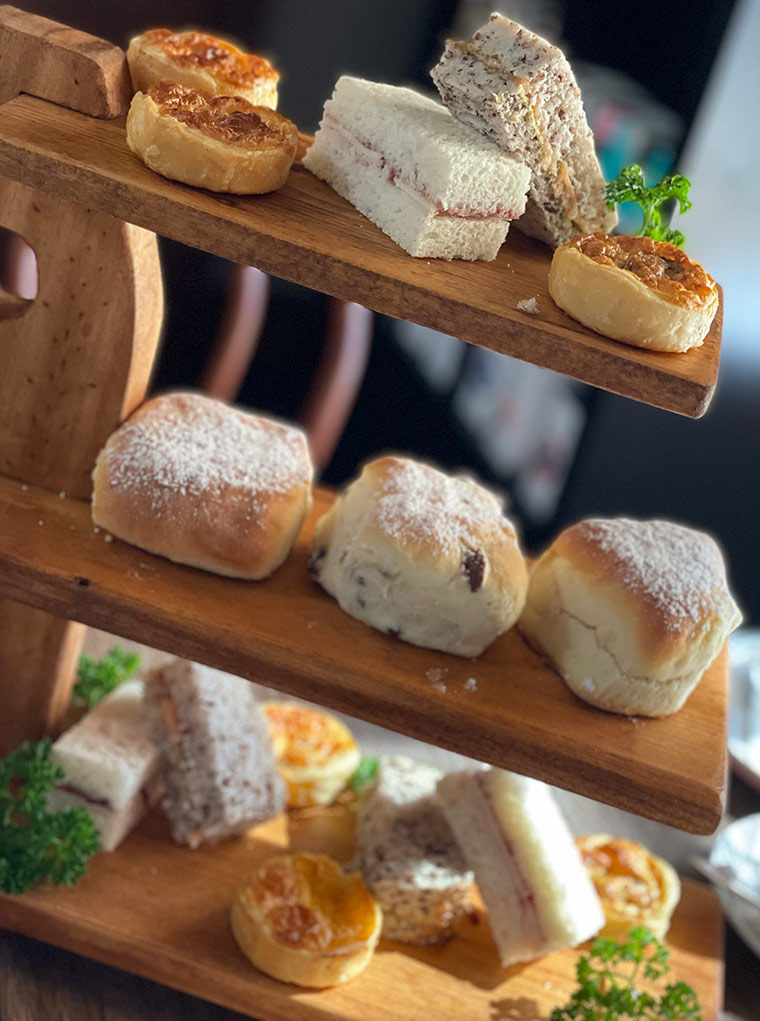 The savoury element of Mrs B’s High Tea was a Mushroom Quiche and a Cheese and Bacon Quiche. They were both crispy and delicious. Sandwiches included the classic salmon, avocado and crème fraiche and turkey and cranberry. The side salad of julienned carrot and beetroot plus lettuce, cucumber and tomato is a nice addition to the menu.