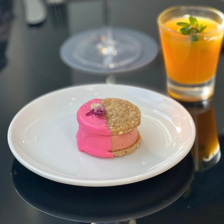 It’s easy to see why the ice cream sandwich is one of his favourite items on the menu – the oat cookie provides the perfect crunch and the surprise rosella jam centre marries beautifully with the strawberry gum ice-cream.
