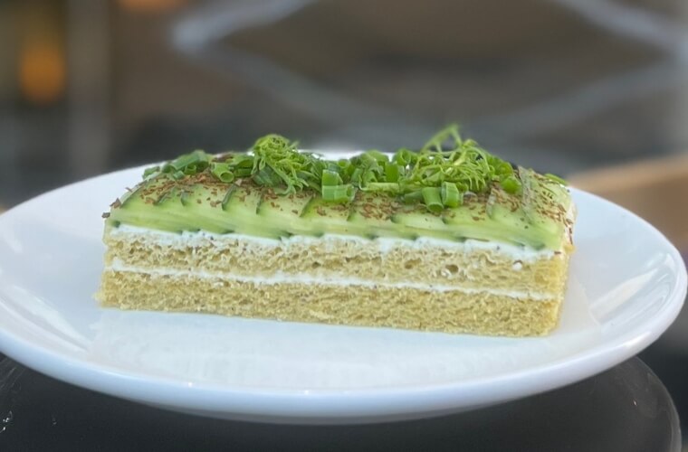 Then there’s the cucumber and mountain pepper spiced cream cheese finger sandwich, an explosion of green that is layered much like an opera cake and topped with little slivers of cucumber fanned out.