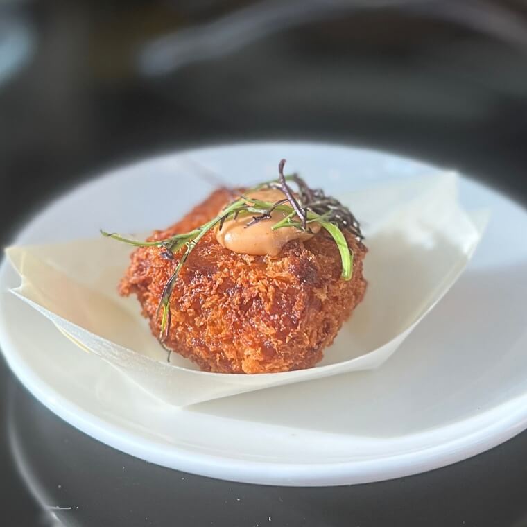 It’s hard to pick a clear winner here: the roast chicken croquette with native thyme and Kakadu plum aioli is divine, while the smoked salmon served in a charcoal slider with dessert lime is also a standout.