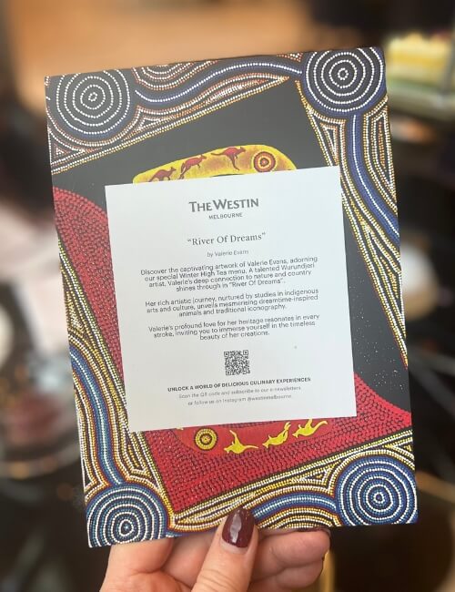 Then there’s the beautiful artwork of Wurundjeri artist Valerie Evans, whose piece “River of Dreams” is used as the backdrop for the Winter high tea menu.