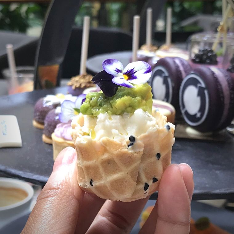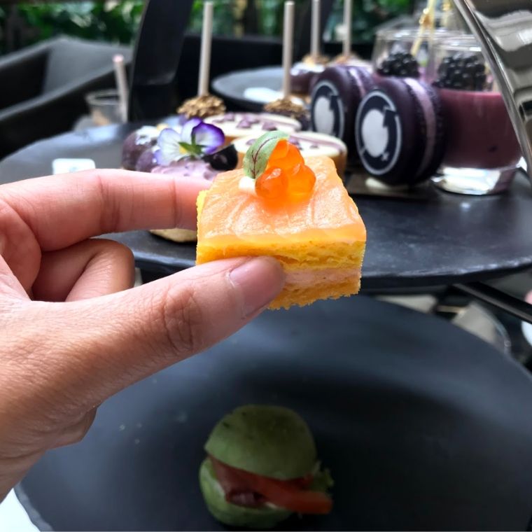 Finishing off on the savoury tier, we indulged in a layered vegetarian offering that consisted of a sandwich topped with Pumpkin Puree, Baked Sweet Potato and all beautifully presented in an array of colours and edible flowers. The perfectly balanced Philly Blueberry Tart served as a path onto the sweets tier that we happily gobbled down and made our way upstairs to purple heaven!