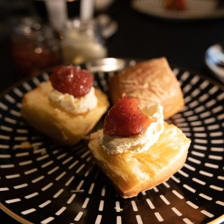 Both menus include five savoury elements and three sweet; and, just to shake things up even more – neither have traditional scones! The “sconez” on the regular menu have a real buttery texture closer to a brioche. The plant-based “scone” element was a macadamia friand. Both are served with the Tasmanian strawberry and lemon myrtle jam which is more fruit than jam and totally delicious. One menu has clotted cream and the other a vanilla cream which felt like a thickened nut milk that had been whipped a little. Unfortunately, it didn’t hold its structure as well as the traditional cream, but it was still delicious none the less.