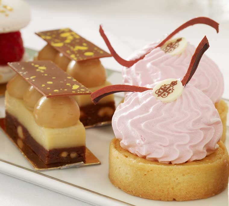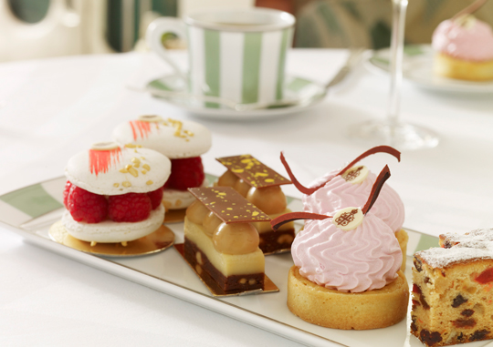 The next course were Claridge’s world famous fruit and plain scones served with Cornish clotted cream and Marco Polo gelee which is infused with bergamont and vanilla pods – divine. The scones certainly lived up to their reputation, and if we hadn’t seen the selection of pastries ahead of us we would have ordered more. We chose 2nd flush Darjeeling and steamed green tea to go with these and both complemented the scones well.