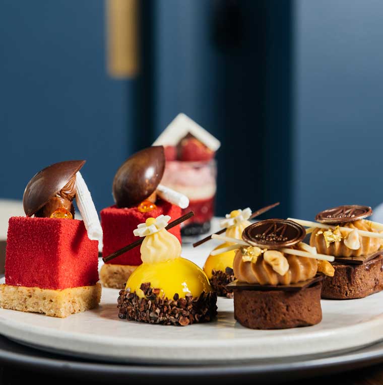 Save room for the top tier sweet selection with the show stopping bright ‘red cube’ of lychee mousse with almond pain de gene base. The Gianduja whipped ganache tart with golden hazelnut features the hotel’s signature M Gallery logo, while the highlight for our party was the glossy Passionfruit jelly and cream cheese layered dome with pistachio sponge.