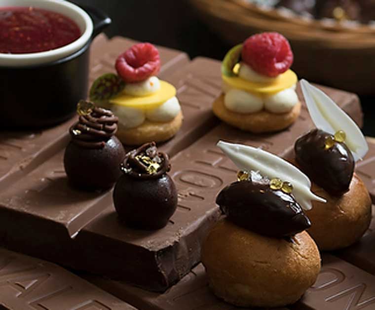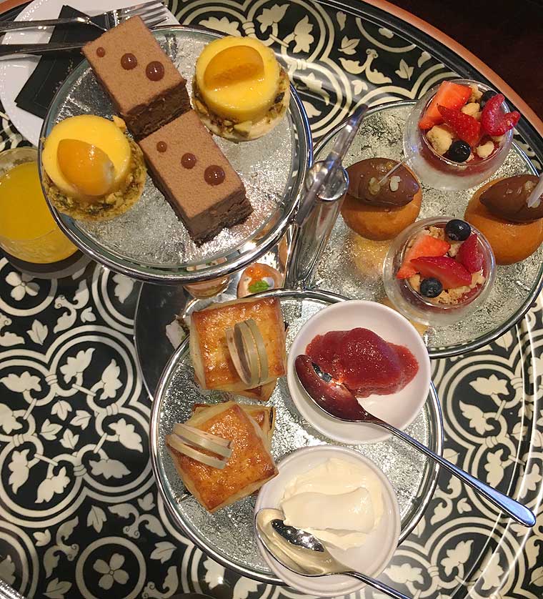 The freshly baked scones are excellent but not all the desserts hit the spot. The exotic fruit tartlets have a texture and flavour that we dislike and leave these behind, but the rest are more pleasing and in line with what we’d expect. The star attraction is the Valrhona chocolate ganache on brioche and it’s just the sugar hit we need to go back outside into the heady heat of the day.