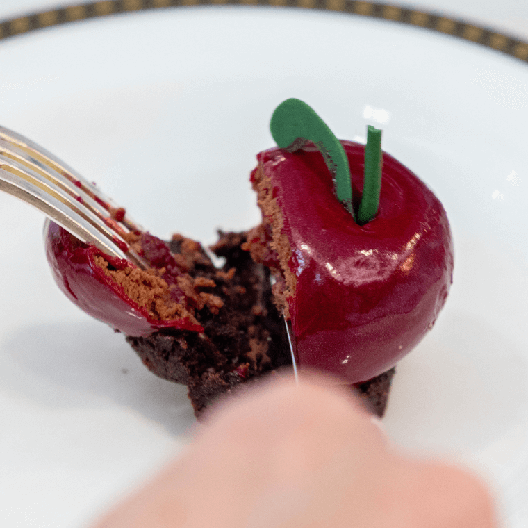 Equally striking was the Amarascata cherry. Glossy and red, glazed to a mirror shine, it was designed to look just like a real cherry, complete with a tempered green chocolate stem. Cutting through the glossy shell revealed a rich chocolate mousse centre, indulgent and velvety, a showstopper in both presentation and taste.