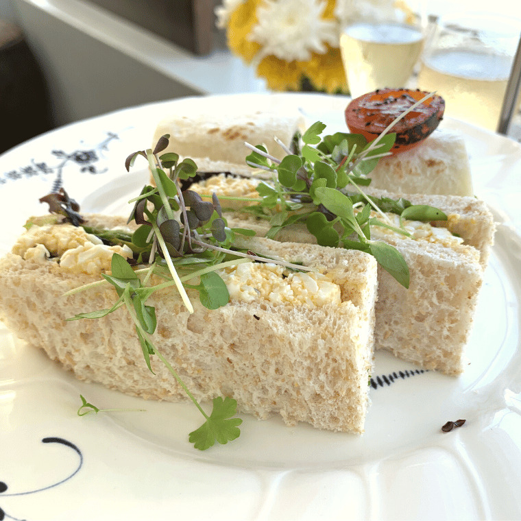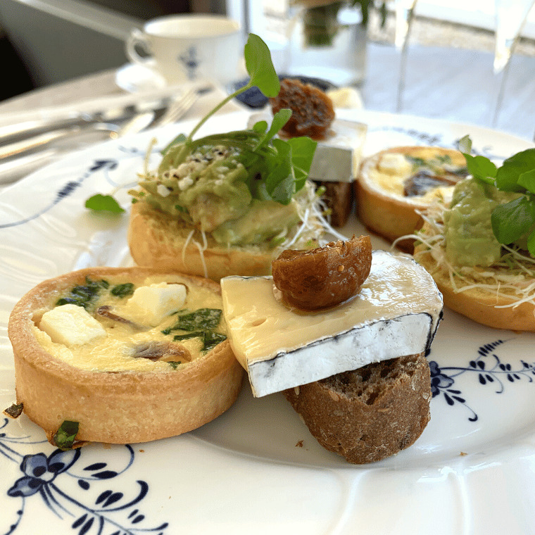 We start the High Tea experience with the warm savoury selection which including the superb spinach, caramelised onion and feta quiche. Continuing the savour odyssey is the cheesy goodness of Woombye Ash Brie topped with fig. I’ve long been a fan of the Sunshine Coast cheese makers Woombeye Cheese Company and it’s pleasing to see their handcrafted Ash Brie featured on the seasonal menu. The delicate egg and truffle mayonnaise finger sandwiches were another savoury standout.