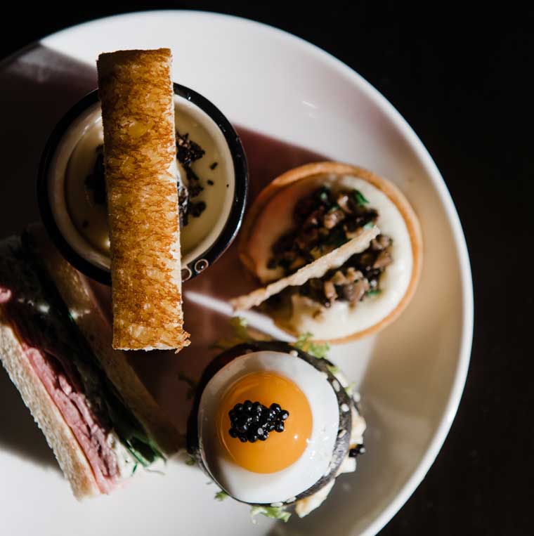 Free Range chicken & truffle rillettes, truffle brioche, whipped celeriac - Tournedos Rossini finger sandwich, beef, truffle, foie gras parfait